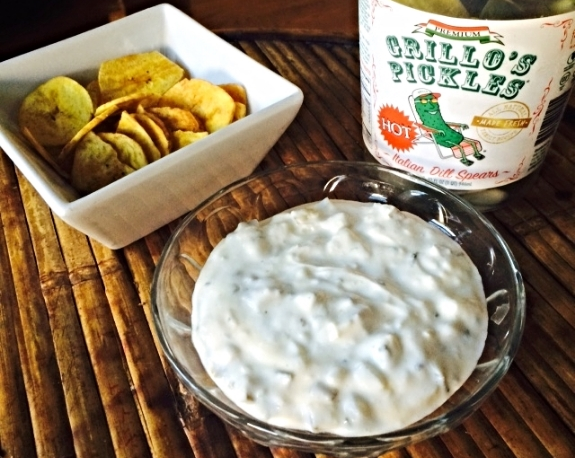 Pour the yogurt into a bowl. Chop 4-6 pickle spears, as fine or chunky as you prefer. Remove the peels and chop the garlic cloves. Chop the chives finely, removing the roots and the leafy ends. Add the pickles and the garlic to the greek yogurt. Pour liquid from the pickle jar into the yogurt to achieve the consistency of your choice. Add garlic powder, salt and pepper to taste.